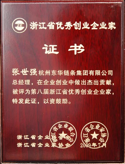 10月29日,在省人民大會(huì)堂召開的“2009浙江省企業(yè)家活動(dòng)日”上,集團(tuán)總經(jīng)理張世強(qiáng)被授予“第八屆浙江省優(yōu)秀創(chuàng)業(yè)企業(yè)家”榮譽(yù)稱號(hào)。